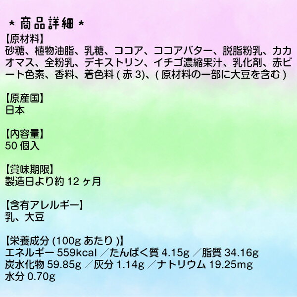 【商品サイズ】 約14.5×14×8cm 【主な仕様】 50ヶ入|占い付 【商品詳細】 サクサク食感のおいしいイチゴチョコです 占い付き! 【検索タグ】 お菓子,チョコ,いちご